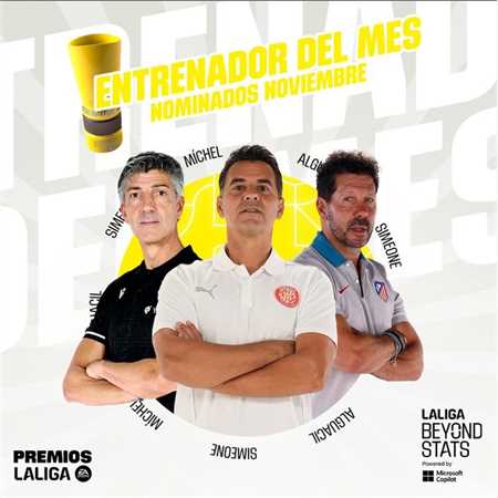 北京时间11月21日凌晨,西甲官方公布了11月最佳主帅的候选名单,其中,阿尔瓜西尔、米歇尔和西蒙尼在列。