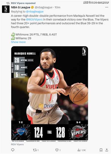 北京时间12月3日,nba g联赛,里奥格兰德河谷毒蛇队128-124俄克拉荷马蓝衣队。这场比赛之前火箭队再度下放了惠特莫尔,因为麦克维被下放的第一场比赛10中2过于拉胯,毒蛇队想拥有竞争力还是需要一个真正意义上的领袖,那么这个人就是白魔。