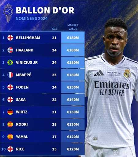 在2024金球奖30人的候选名单公布之后,德转也统计出了这30名球员的身价,其中贝林厄姆、哈兰德、维尼修斯、姆巴佩同为1.8亿欧元并列第一。