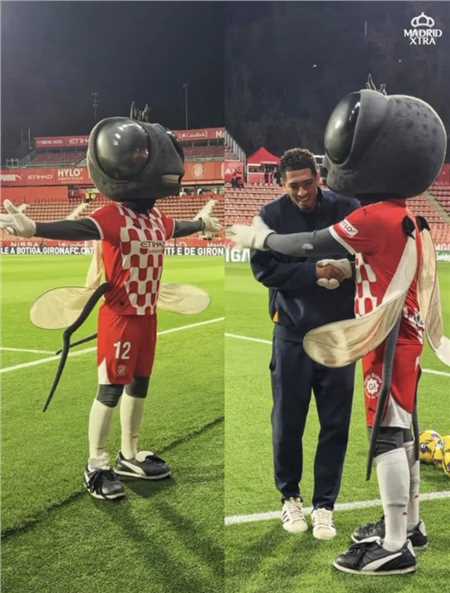 据悉,赫罗纳的吉祥物是一只名为“西萨”(sisa)的苍蝇。赛前,它与皇马球星贝林厄姆进行了互动,双方拥抱了一下,然后它模仿了贝林厄姆的庆祝动作。