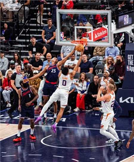 鲍威尔中投拿下新球馆第一球,哈登也抛投得分。太阳这边比尔突破,三分。杜兰特、泰厄斯-琼斯续上远投火力。对面鲍威尔再进三分,凯-琼斯、德里克-琼斯3次吃饼扣篮,快船22-18领先。阿伦命中三分,蒙特-莫里斯突破上篮,太阳首节23-22反超。第二节凯文-波特抢断扣篮,克里斯-邓恩三分。太阳这边努尔基奇、阿伦远投回应。比尔、奥尼尔、布克外线三连击,太阳40-27领先。哈登突破乏力,还连续失误,快船上半场最多落后14分。鲍威尔两次突破得分,快船半场追到39-47。哈登11投2中,三分5投0中得到4分9个篮板4次助攻4次失误。